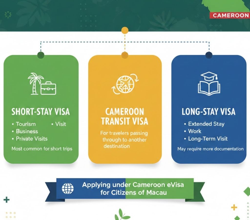 When applying under Cameroon eVisa for Citizens of Macau, you’ll encounter different visa categories depending on your purpose of travel. Common types include: