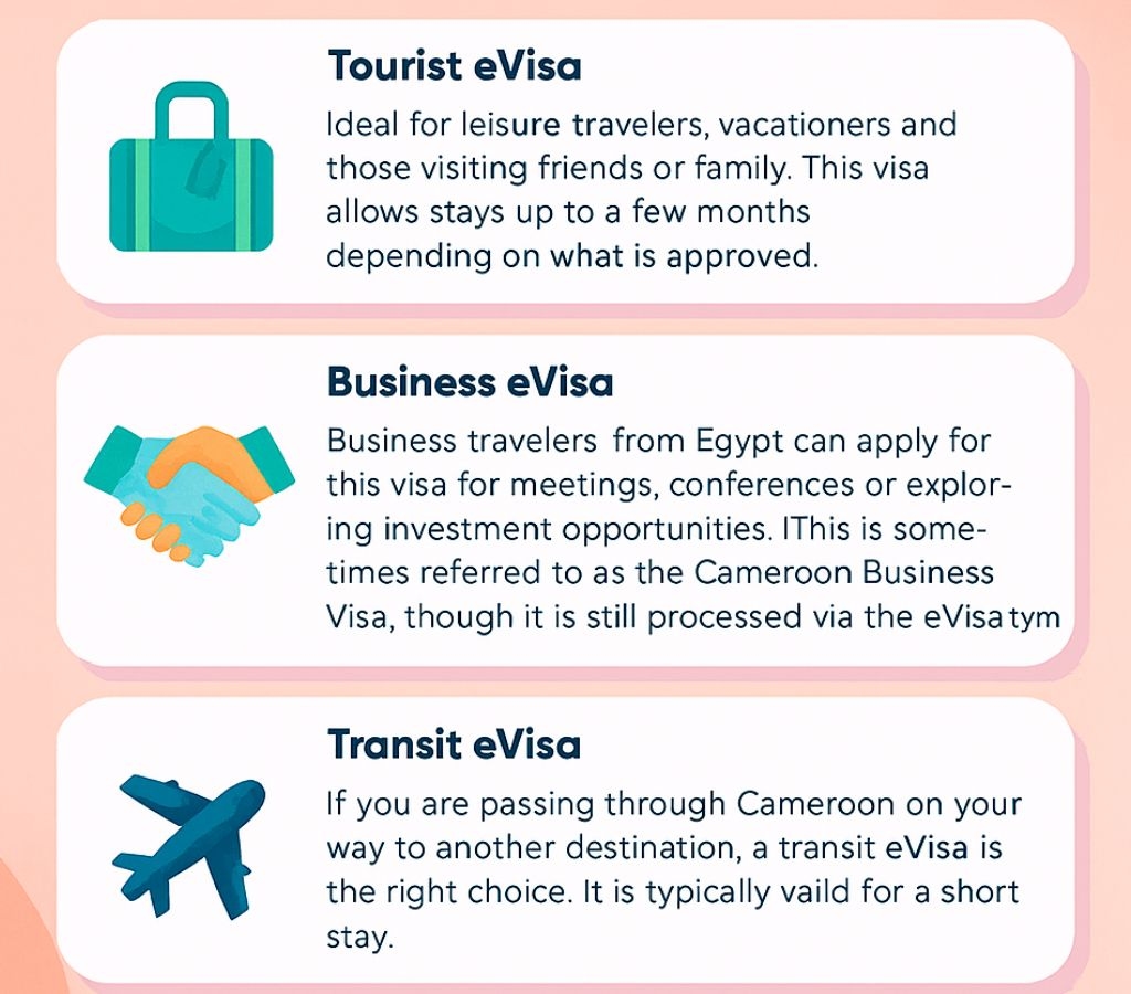 These options under the Cameroon eVisa for Egyptian Citizens framework give flexibility depending on the purpose of your journey.