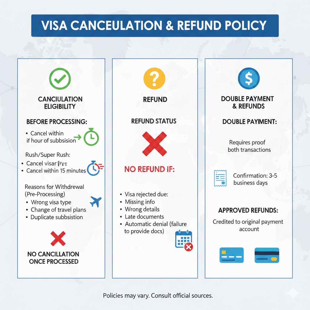 There is no possibility of getting the money back if a visa is rejected due to the lack of necessary information, the provision of wrong details, or the failure to submit documents on time.