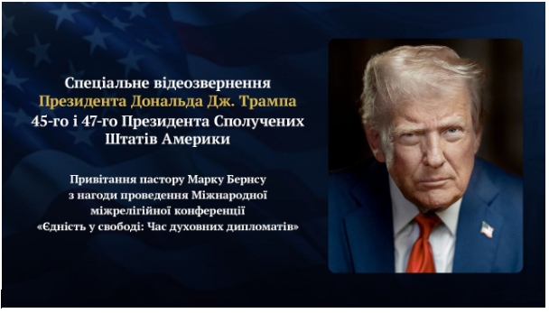 Спеціальне відеозвернення Президента Дональда Дж. Трампа пастору Марку Бернсу з нагоди Міжнародної міжрелігійної конференції «Єдність у свободі: Час духовних дипломатів» на платформі «АЛЛАТРА».