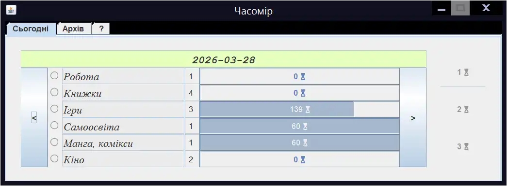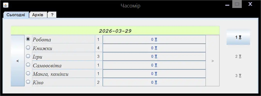 Кожна кнопка запускає таймер на 1-3 години, водночас смужка прогресу заповнюється хвилинами. Кожні 15 хвилин програма подає сигнал. Окремо подається сигнал кожну повну годину і коли таймер завершує роботу.