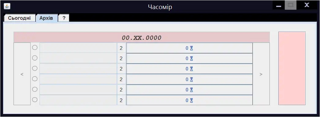 Великі бокові кнопки гортають дні локального або глобального архіву.