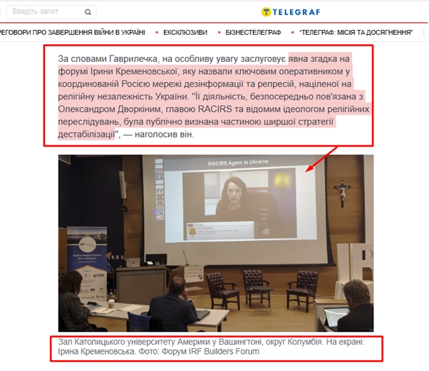 За такі її "заслуги" та зв'язки з РАЦИРС її особливо згадали на міжнародному форумі IRF Builders у Вашингтоні - Civil Society Congress. Тобто Ірину Кременовськуї, назвали ключовим оперативником у координованій росією мережі дезінформації та репресій, націленої на релігійну незалежність України. "Її діяльність, безпосередньо пов'язана з Олександром Дворкіним, главою РАЦИРС та відомим ідеологом релігійних переслідувань, була публічно визнана частиною ширшої стратегії дестабілізації