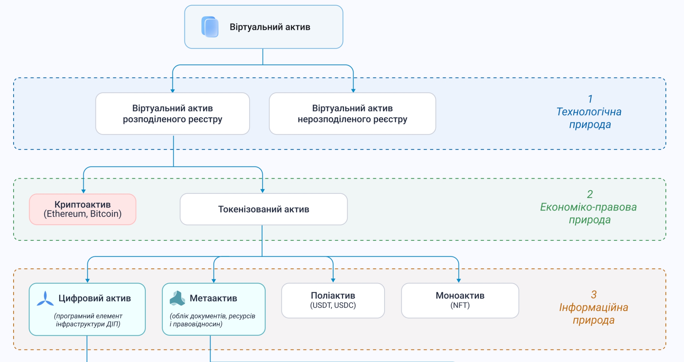 Згідно з комплексною класифікацією віртуальних активів, Науково-дослідного центру економіко-правових рішень у сфері застосування технологій розподіленого реєстру, криптовалюти належать до активів. що не мають похідності від реального майна. Через об’єктивну відсутність похідності та забезпеченості криптоактивів будь-яким майном або майновими правами операції з ними пропонується класифікувати як «фінансові операції з високими ризиками» і, як наслідок, віднести їх до сфери регулювання суб’єктами державного фінансового моніторингу та профільним законодавством відповідно.