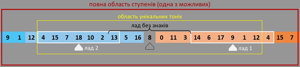 Тут видно, що переміщення тоніки на 4 і на 14 мають одну і ту ж ноту(4), але у правому(лад1) це якийсь дієз (10 квінт від 8), а в лівому це (дубль-)бемоль.