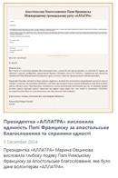 “Я пастор Марк Бернс і я звертаюся до всіх волонтерів АЛЛАТРА, а також до всіх, хто зазнав переслідувань з боку російської православної церкви, зокрема до тих, кого переслідує антикультовий рух в росії та Україні. Я хочу сказати вам, ви не одні. Ми вас чуємо. Боротьба проти них вже почалася. Ви не залишилися самі. Я тут, щоб ви знали, вся Америка стоїть за вами. Тому моє послання до вас: зберігайте надію, продовжуйте боротися. Не опускайте рук, ніколи не здавайтеся. Пам’ятайте, хто ви. І знайте, в результаті перемога буде за вами і за всіма нами, хто стоїть за свободу проти тиранії російської федерації, яка намагається знищити свободи людей у всьому світі. Я пастор Марк Бернс. Я підтверджую це послання і борюся за вас, а також за кожного, хто відстоює свободу