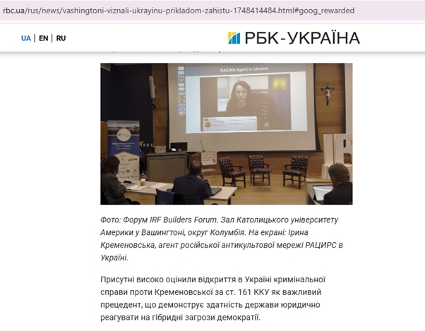 Слід знати, що одним із прикладів діяльності РАЦИРС в Україні є Центр економіко-правових досліджень (ЦЕПД), який був заснований широко відомими догхантерами Іриною Кременовською та Олексієм Святогором у 2017 році. Цей центр активно поширює дезінформацію, підриваючи демократичні процеси в Україні. Через ресурси, такі як «Вільне слово», ЦЕПД публікує матеріали, що дискредитують релігійні групи з Європи та США, та активно підтримує проросійські наративи, що сприяють подальшій ескалації напруженості в Україні.