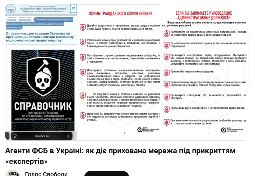 Згадаємо також, що сайт місіонерського відділу Новосибірської єпархії РПЦ протоієрея Олександра Новопашина, другий за значимістю сайту РАЦИРС. І саме на ньому 2022 року було вивішено і досі знаходиться документ під назвою "Довідник для громадян України з організації Громадянського опору" Київському маріонетковому уряду. Ця методичка, по суті, є практичним керівництвом із проведення саботажу в Україні під час вторгнення російської армії, прямим керівництвом до дії у воєнний час