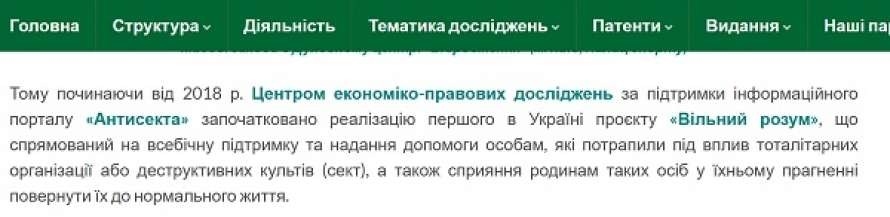 З моменту створення веб-ресурсу Центру економіко-правових досліджень у 2017 році на його сайті активно розміщувалися посилання на їхній партнерський проросійський ресурс «Антисекта», який є медіаінструментом РПЦ. Окрема сторінка присвячена спільному проєкту «Антисекти» та Центру економіко-правових досліджень під назвою «Вільний розум». На сторінці читачів закликають активно звертатися до спеціалістів проросійської «Антисекти» за допомогою: