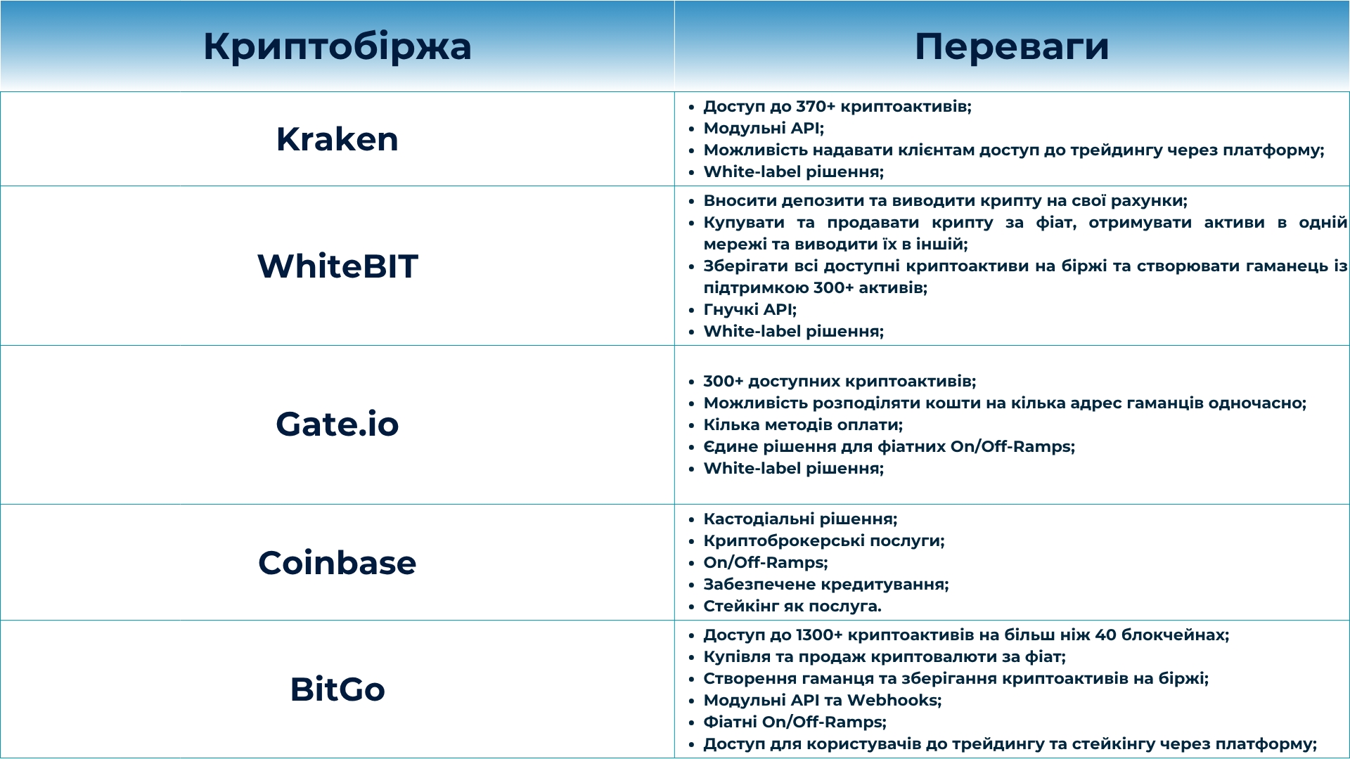 На основі опитування я склав рейтинг 5 найкращих криптобірж, які компанії найчастіше обирають для інтеграції CaaS, а також виділив ключові переваги, які роблять їх привабливими для бізнесу: