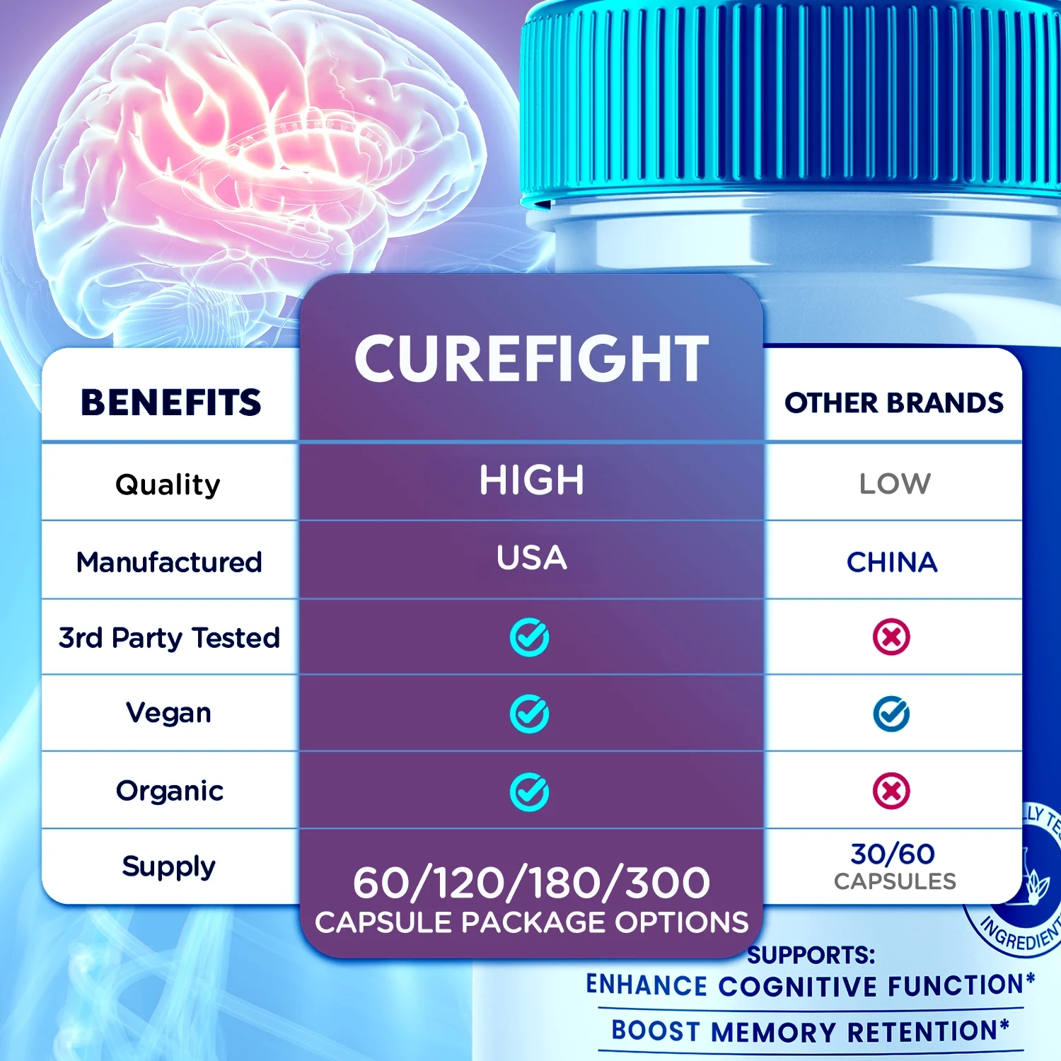 Cure Fight is an advanced brain health supplement formulated to enhance memory, support cognitive function, and foster neuroprotective resilience in daily life. Its unique blend features omega-3 fatty acids, herbs like Ginkgo Biloba and Bacopa Monnieri, neuroactive phospholipids, B-vitamin complex, and powerful antioxidants. With a philosophy focused on natural support rather than synthetic stimulation, Cure Fight delivers comprehensive aid for memory, focus, and long-term clarity — without the risk of harsh chemicals or habit-forming stimulants.