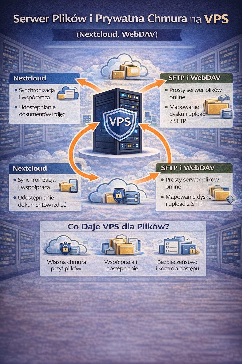 Jeżeli potrzebujesz prostszego rozwiązania, VPS może działać jako klasyczny serwer plików przez SFTP albo WebDAV. To podejście jest często szybsze do wdrożenia i mniej „ciężkie” niż pełna platforma typu Nextcloud. Właśnie dlatego fraza „serwer plików vps” pojawia się zarówno wśród osób technicznych, jak i tych, które po prostu chcą bezpiecznie trzymać pliki w jednym miejscu. Natomiast zapytanie „webdav vps konfiguracja” zwykle dotyczy scenariusza, w którym użytkownik chce mapować dysk w systemie i pracować na plikach jak na zwykłym folderze.