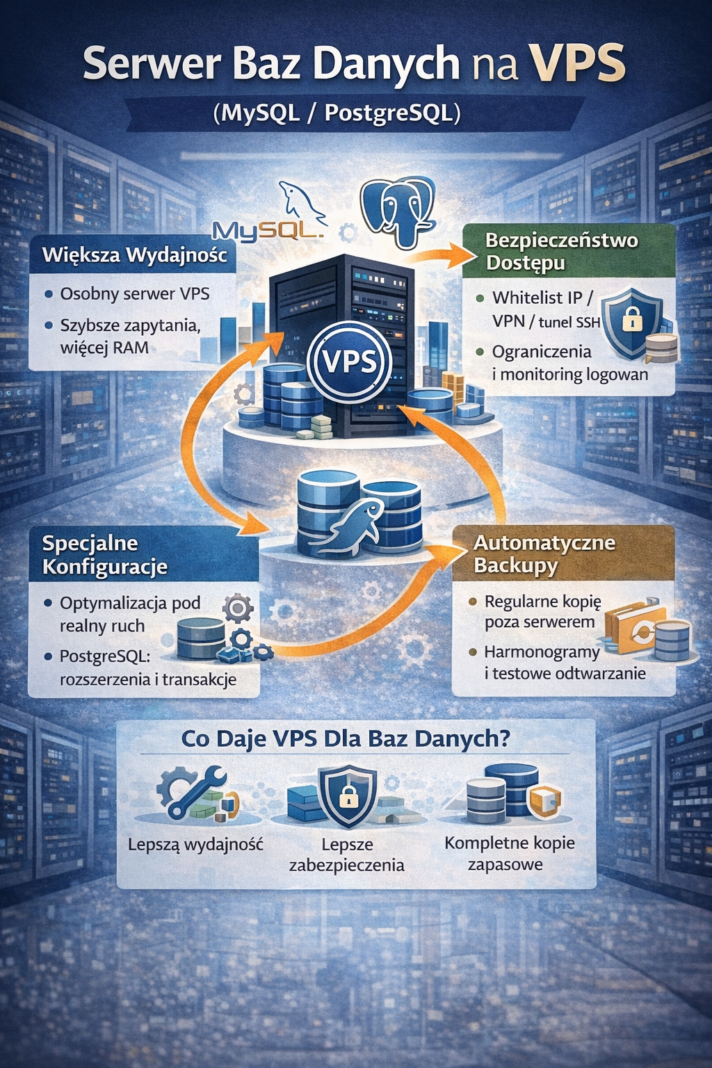 W wielu projektach największym obciążeniem nie jest sam „frontend”, tylko baza danych. To właśnie tam trafiają zapytania z panelu administracyjnego, sklepu, API, wyszukiwarki, filtrów oraz raportów. Dlatego VPS bardzo często pełni rolę osobnego serwera bazy danych — szczególnie wtedy, gdy aplikacja rośnie i zaczyna wymagać stabilnej wydajności. Jeśli ktoś wpisuje „vps jako serwer bazy danych”, zwykle szuka rozwiązania, które daje większą kontrolę niż typowa baza na hostingu współdzielonym.