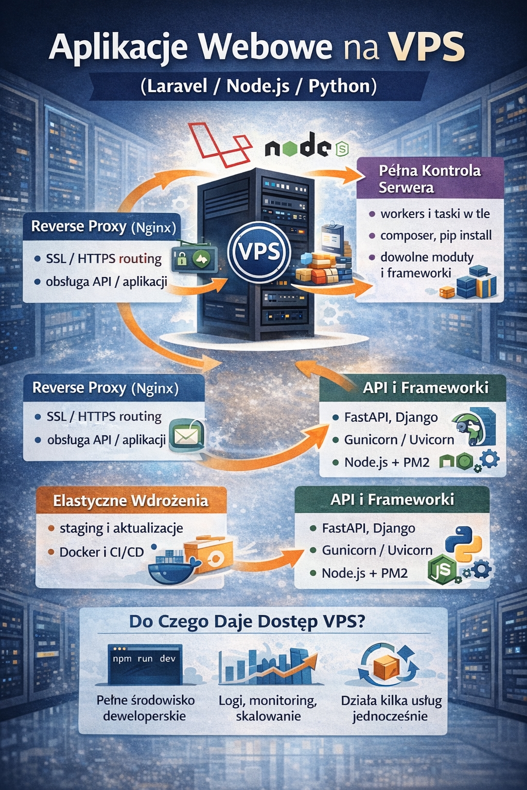 Dużą przewagą VPS jest możliwość uruchomienia aplikacji w taki sposób, jak wymaga tego technologia. Laravel często potrzebuje workerów kolejek (queues), harmonogramu zadań i stabilnego środowiska pod Composer. Node.js działa jako proces serwerowy, który musi być utrzymywany cały czas (np. przez systemd lub PM2). Pythonowe aplikacje API (FastAPI, Django) wymagają serwera aplikacyjnego (np. Gunicorn/Uvicorn) i poprawnej konfiguracji reverse proxy. To właśnie dlatego w praktyce często pojawia się temat „laravel na vps konfiguracja” — bo VPS daje pełną kontrolę nad tym, jak aplikacja jest uruchomiona i jak zachowuje się pod obciążeniem.