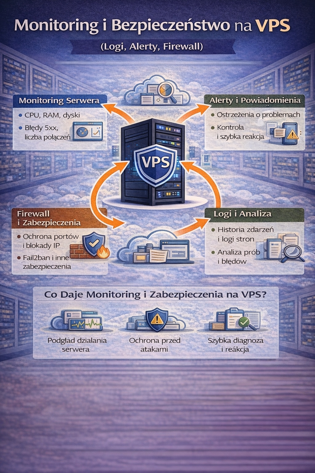 Podsumowując: VPS to świetne rozwiązanie dla osób, które chcą mieć kontrolę nad bezpieczeństwem i stabilnością. Monitoring, alerty, firewall, Fail2ban i logi sprawiają, że serwer przestaje być „czarną skrzynką”. Dzięki temu możesz szybciej reagować na awarie, lepiej chronić dane i budować projekt, który działa pewnie nawet wtedy, gdy ruch rośnie lub pojawiają się ataki.