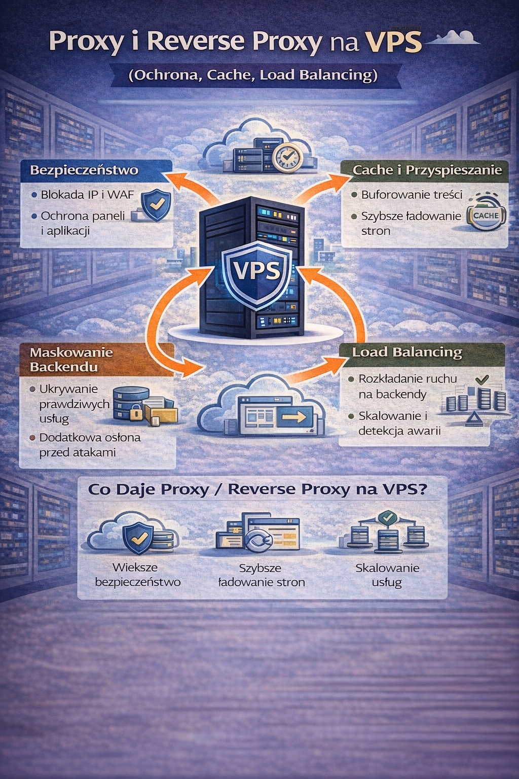 Ostatnim ważnym zastosowaniem jest load balancing, czyli rozdzielanie ruchu pomiędzy kilka serwerów. Jeśli masz dwa lub więcej backendów, reverse proxy może równomiernie rozkładać zapytania, a także wykrywać awarie i kierować ruch tylko do działających instancji. Dlatego hasło „load balancing vps” pojawia się szczególnie w projektach, które rosną i zaczynają wymagać skalowania. W skrócie: VPS jako reverse proxy to fundament infrastruktury, która jest szybsza, bezpieczniejsza i łatwiejsza do rozbudowy.