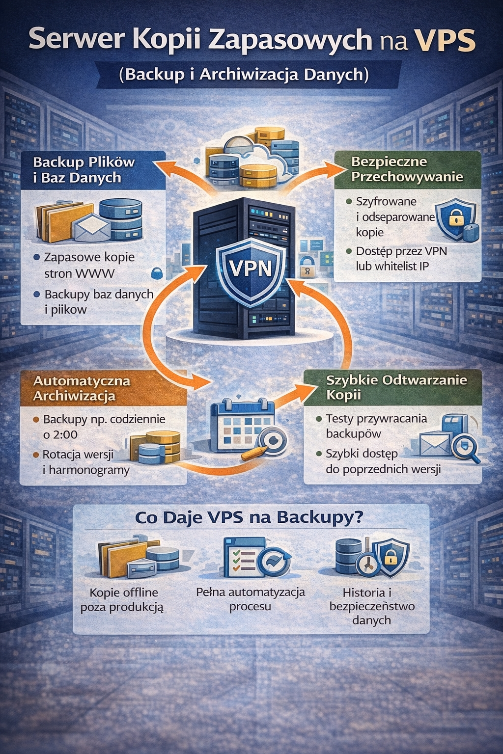 Jednym z najbardziej praktycznych zastosowań VPS jest rola serwera kopii zapasowych. Wiele osób robi backupy „na tym samym hostingu”, gdzie działa strona lub aplikacja, ale to często daje fałszywe poczucie bezpieczeństwa. Jeśli dojdzie do awarii dysku, błędu administracyjnego, ataku lub problemu z kontem — możesz stracić jednocześnie produkcję i kopie. Właśnie dlatego fraza „serwer kopii zapasowych vps” pojawia się tak często: chodzi o stworzenie niezależnego miejsca, gdzie backupy są odseparowane od głównego systemu.