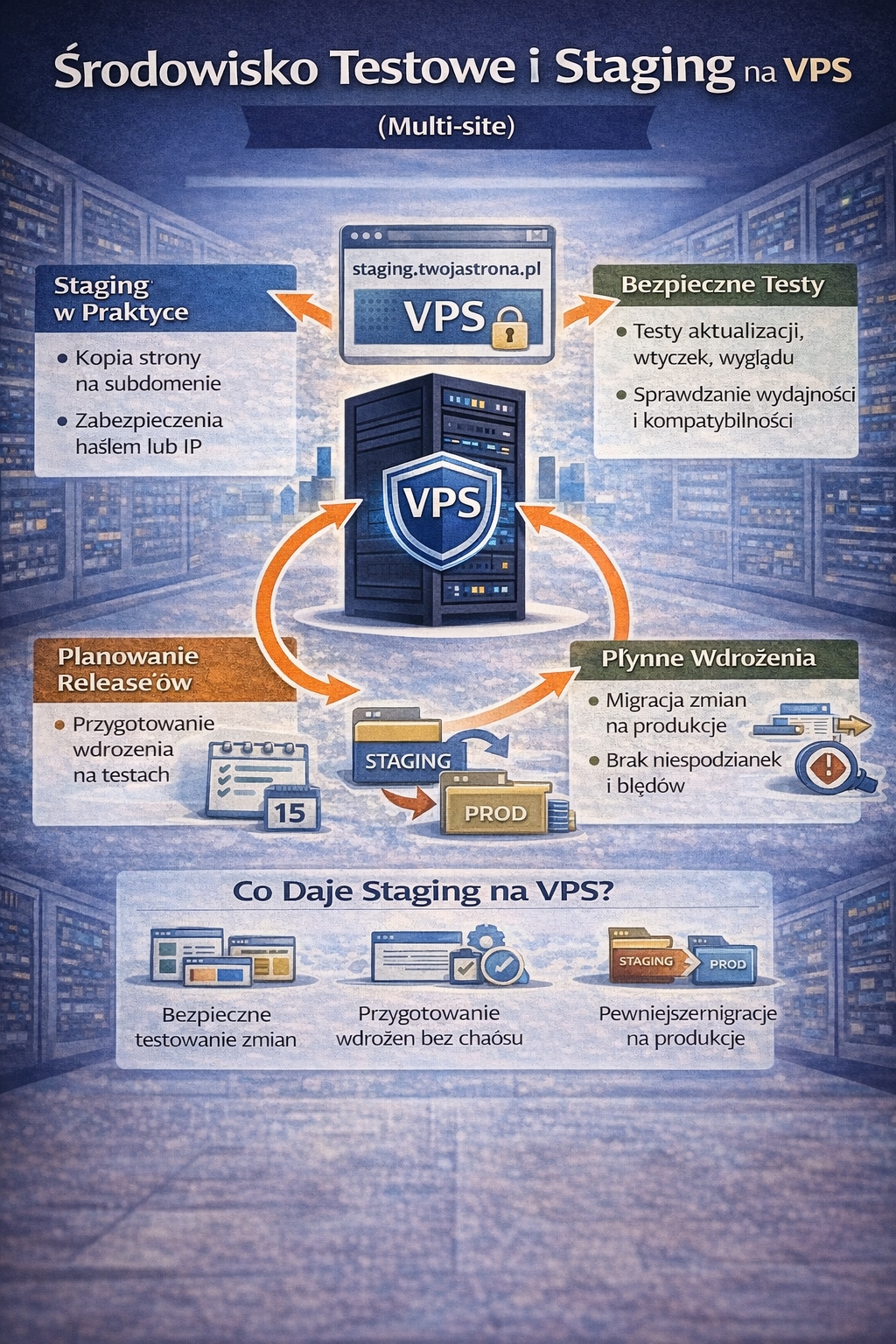 Jednym z najbardziej niedocenianych zastosowań VPS jest stworzenie środowiska testowego, czyli staging. W praktyce staging to kopia Twojej strony lub aplikacji, na której możesz bezpiecznie sprawdzać zmiany przed wdrożeniem na produkcję. Dla WordPressa, sklepów internetowych i aplikacji webowych jest to ogromna przewaga, bo aktualizacje wtyczek, zmiany w motywie albo nowe funkcje potrafią zepsuć stronę w najmniej odpowiednim momencie. Dlatego hasło „staging na vps” jest tak popularne — pozwala testować bez ryzyka utraty sprzedaży czy spadku pozycji w Google.
