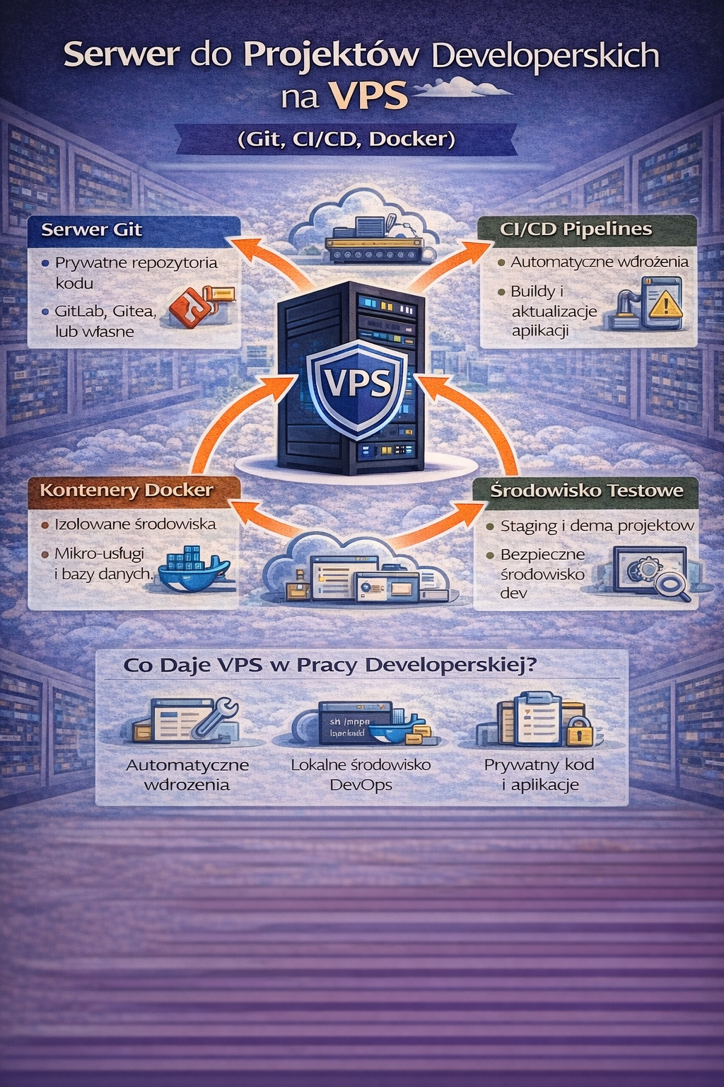 VPS to bardzo wygodna baza dla projektów developerskich, zwłaszcza jeśli tworzysz aplikacje, zarządzasz kilkoma stronami albo pracujesz w zespole. W takim przypadku serwer nie jest tylko „miejscem na hosting”, ale elementem procesu wytwarzania oprogramowania: testowania, wdrażania i utrzymania. Właśnie dlatego frazy typu „deploy na vps” oraz „ci cd vps” są tak często wyszukiwane — bo VPS pozwala zbudować prosty, ale profesjonalny pipeline wdrożeń bez skomplikowanej infrastruktury korporacyjnej.