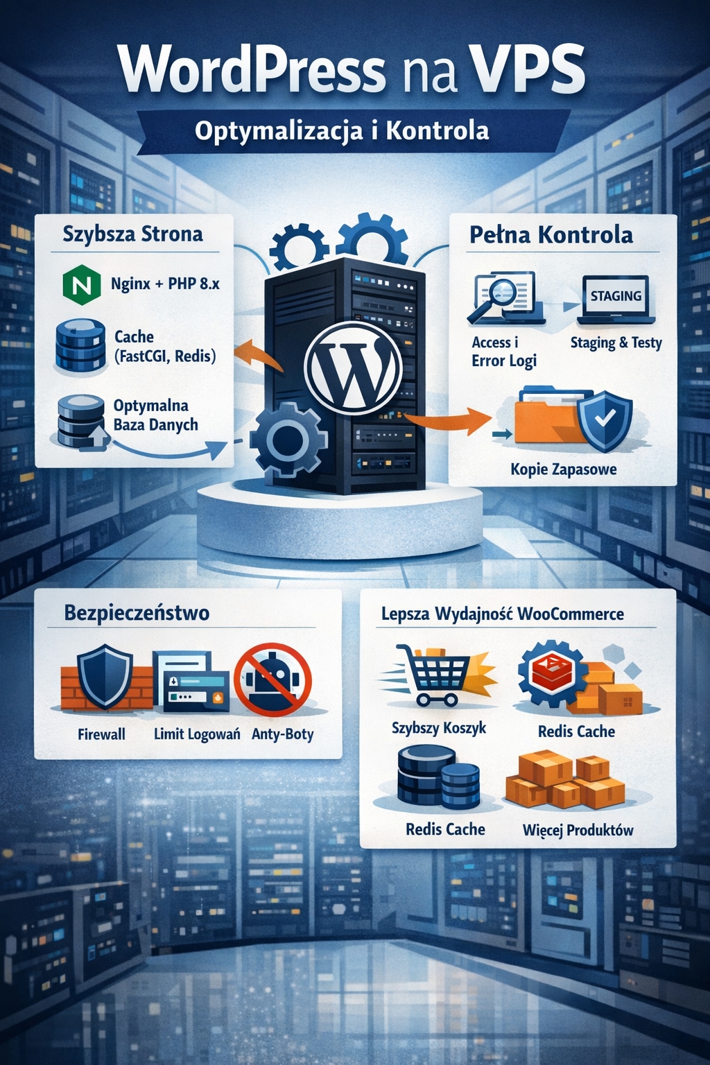 Największą przewagą jest możliwość ustawienia serwera dokładnie pod WordPressa. Przy zapytaniu „vps wordpress konfiguracja” ludzie najczęściej szukają konkretów: jaka wersja PHP, jaki web server i jak zrobić cache. Na VPS możesz postawić Nginx (często szybszy przy dużym ruchu), dodać FastCGI cache, ustawić odpowiednie limity pamięci, timeouty oraz zoptymalizować bazę danych. To przekłada się na realnie krótszy czas ładowania, lepsze wyniki PageSpeed i mniejsze ryzyko, że strona „padnie” w momencie, gdy kampania reklamowa nagle zwiększy liczbę odwiedzin.