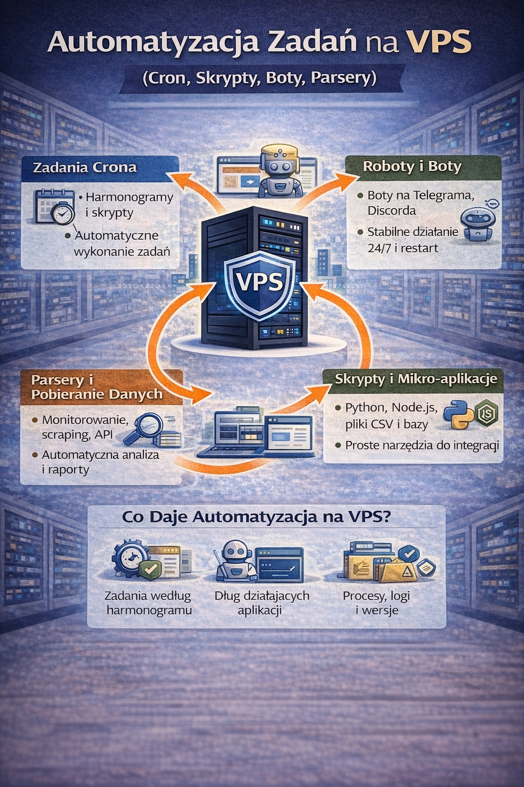 Jednym z najbardziej praktycznych zastosowań VPS jest automatyzacja zadań, czyli uruchamianie procesów, które wykonują pracę „w tle” bez udziału człowieka. Może to być proste odświeżanie danych raz dziennie, generowanie raportów, pobieranie plików, wysyłanie powiadomień albo synchronizacja między systemami. Właśnie dlatego temat „automatyzacja zadań vps” jest tak popularny — VPS daje stabilne środowisko do uruchamiania skryptów bez ograniczeń typowych dla hostingu współdzielonego.