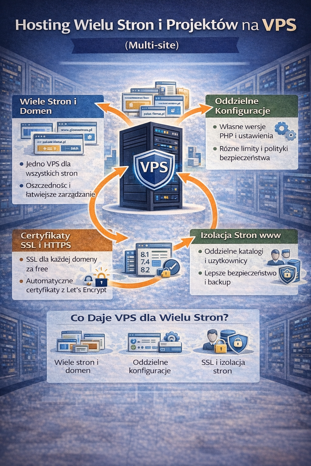 W praktyce wygląda to tak, że na jednym VPS możesz postawić kilka niezależnych witryn, każdą z osobnym certyfikatem SSL, osobną konfiguracją i osobnym katalogiem plików. Możesz też ustawić oddzielne wersje PHP, limity zasobów i różne reguły bezpieczeństwa — zależnie od tego, czego potrzebuje dany projekt. Dla wielu osób ogromną zaletą jest to, że mają jeden panel administracyjny serwera i jedną logikę zarządzania, zamiast kilku różnych kont w różnych firmach hostingowych.