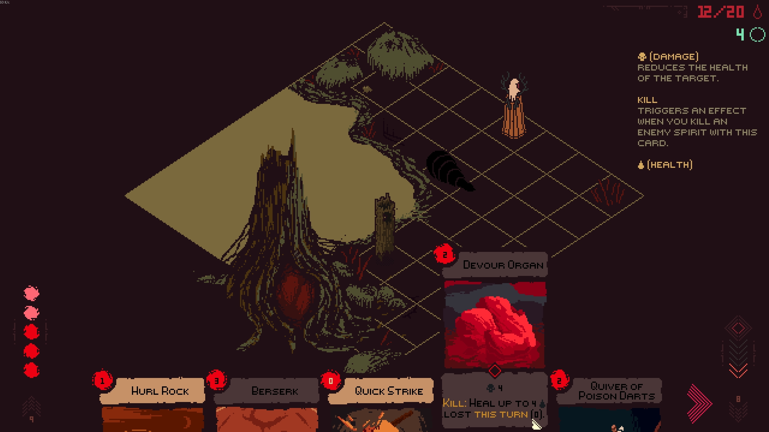 З приводу механік це “камерна тактика”. Арена зазвичай маленька, приблизно 8х8 неправильної форми, фіксована кількість AP (приблизно 5) їх можна витрачати на рух або на карти. Карти тут підв’язані до “Територій” котрих 4, по 3 мапи в кожній. Мапа статична, на ній в фіксованих місцях чекають вороги та чекпоінти. Вороги відроджуються від чекпоінтів. Звідси випливає купа бектрекінгу - доводиться битися з одними і тими самим ворогами. З ворогів та розкиданих просто на мапі ресурсів крафтяться картки. Загалом це не та гра де треба гріндить, потреби в тому немає але брати участь у непотрібних битвах потрібно тільки щоб пройти від пункту А в пункт Б.