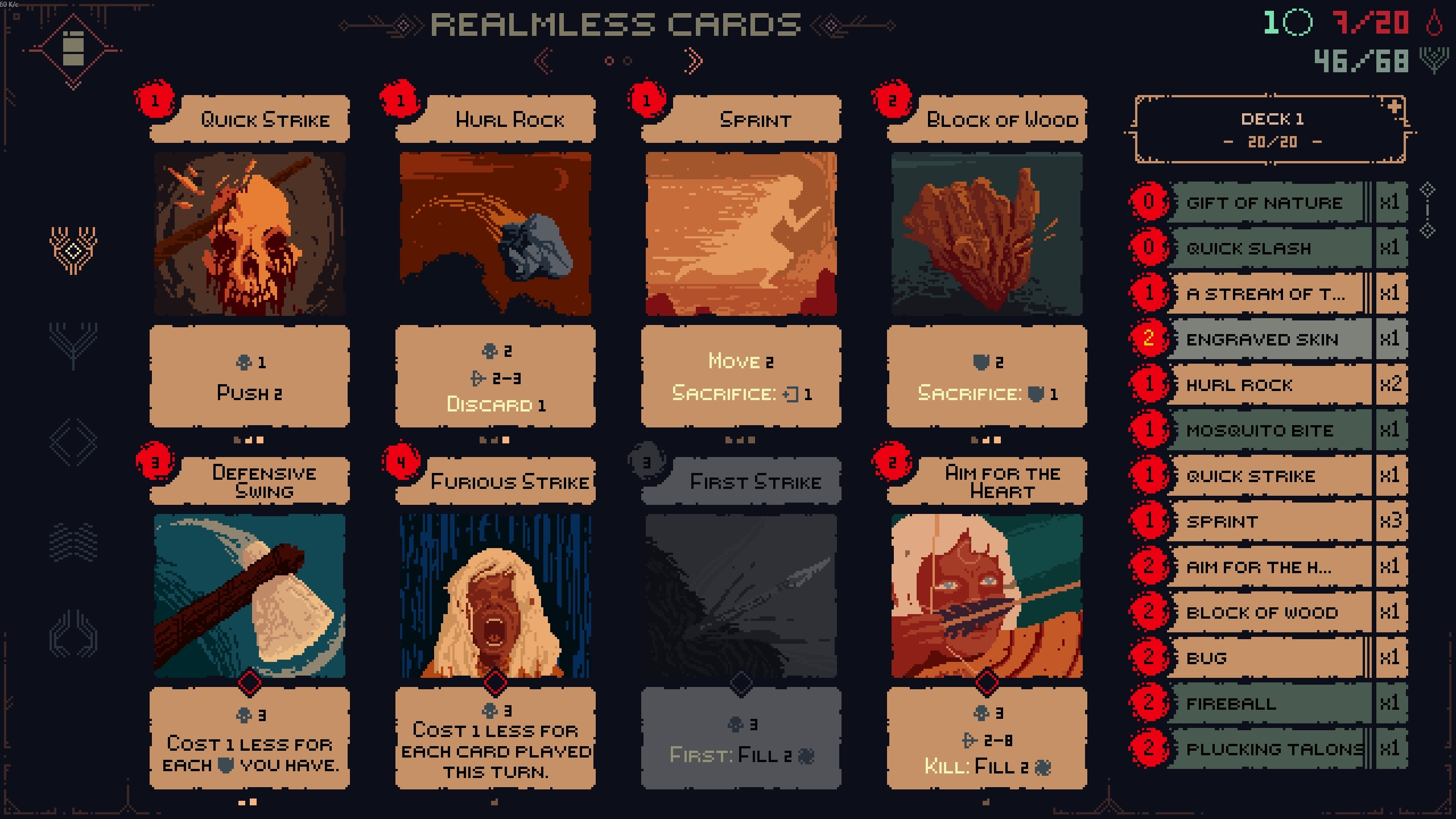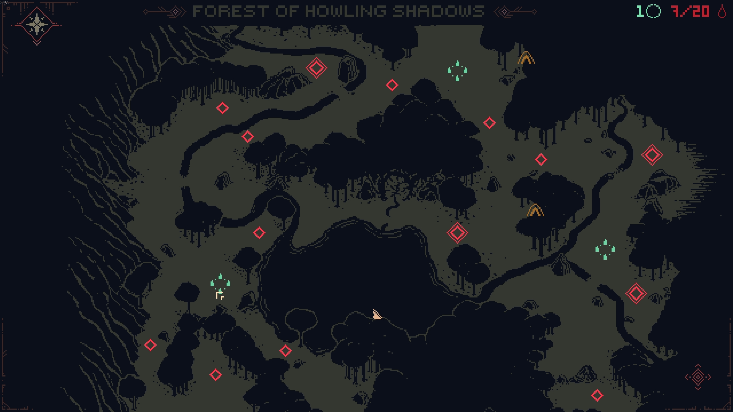 Карта. Території - сторони світу з босом в кінці – вони слугують головним геймченджером механік. На кожній мапі буде щось унікальне – десь це болота сповнені пульсуючими м’ясними рослинами що вибухають, десь це вітер який заморожує тебе. Карткові деки в цій грі прив’язані до територій. Тобто карти з інших територій можна використовувати, але вони будуть коштувати дорожче. Таким чином за гру доведеться зібрати як мінімум 4 деки. Але грінду і рандомного випадіння немає – карти крафтяться вручну.
