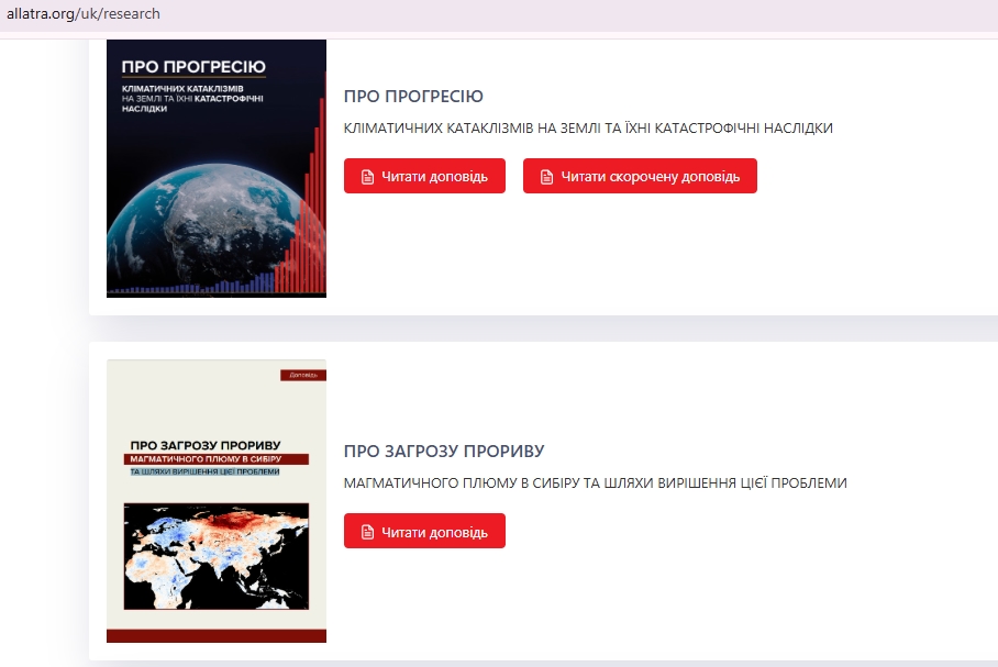 скрин де можна ознайомитися з доповідями АЛЛАТРА https://allatra.org/uk/research