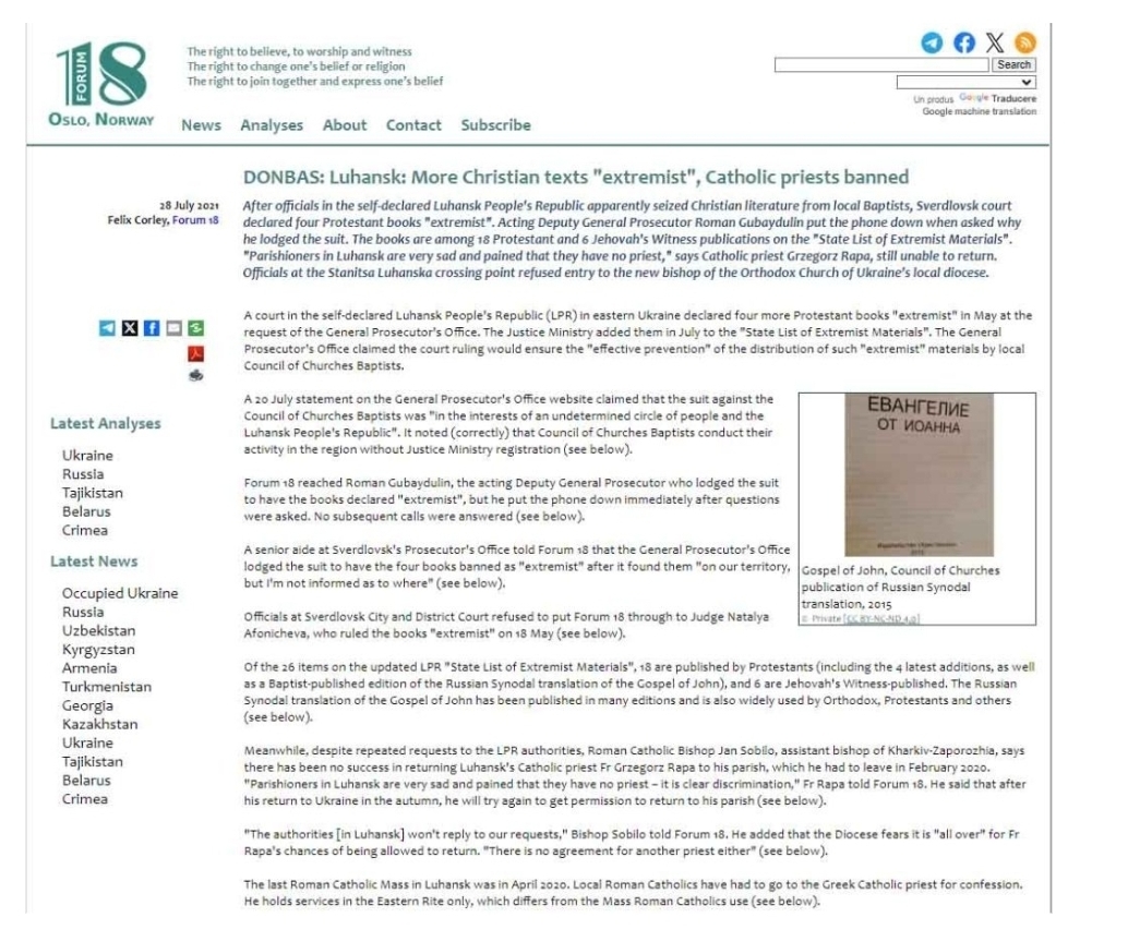 "У наступні роки встановлена росією влада в Криму та Донбасі запровадила репресивні російські закони, які серйозно обмежували релігійну свободу та були спрямовані проти релігійних меншин. Чиновники заборонили релігійну літературу та певні форми релігійної діяльності та висловлювань. Вони також оголосили поза законом цілі релігійні групи, позбавивши їх юридичної реєстрації або оголошуючи їх "екстремістськими" чи "терористичними", незважаючи на те, що вони мирно та легально сповідували свою релігію в Україні протягом багатьох років". Знімок екрана з вебсайту "Форум 18"