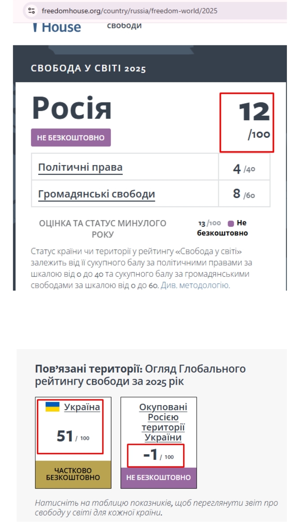 Спираючись на міжнародні індикатори демократії, перш за все Freedom House, станом на 2025 рік, рашка має індекс демократії 12 зі 100, російсько окуповані території України -1 зі 100, тоді як Україна 51 зі 100.