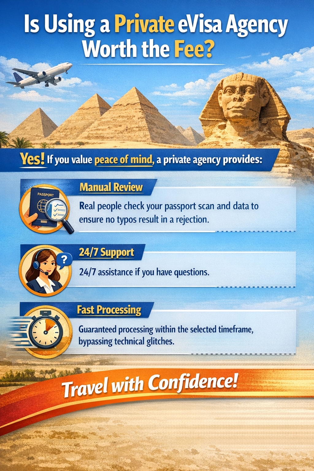 Many travelers ask if paying a service fee to an agency like evisa-egypt.info is worth it. The answer is yes if you value peace of mind. A private agency provides: