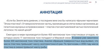Цитата: “В океані вже накопичено понад 200 мільйонів тонн пластику. Аналіз зразків поверхневих вод виявив, що маса пластику перевищує масу зоопланктону в 6 разів. За прогнозами, до 2050 року маса пластику в океані перевищить масу риби.”