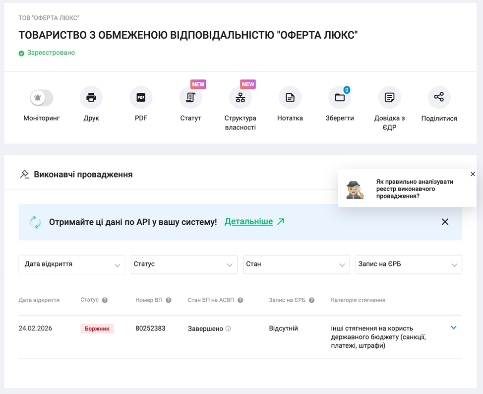 По фірмі 24 лютого 2026 року було відкрито виконавче провадження №80252383 — стягнення на користь Головного управління ДПС у м. Києві з приміткою “ стягнення на користь державного бюджету (санкції, платежі, штрафи)”.