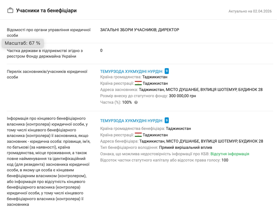Формальний кінцевий бенефіціарний власник “Оферта-Люкс” — Темурзода Хукмудін Нурдін, громадянин Таджикистану, прописаний у Душанбе на вулиці Шотемур. Людина з такою адресою стала власником агробізнесу на Львівщині — класичний “фунт”, якого дістають із шухляди, коли треба поставити прізвище під документами.