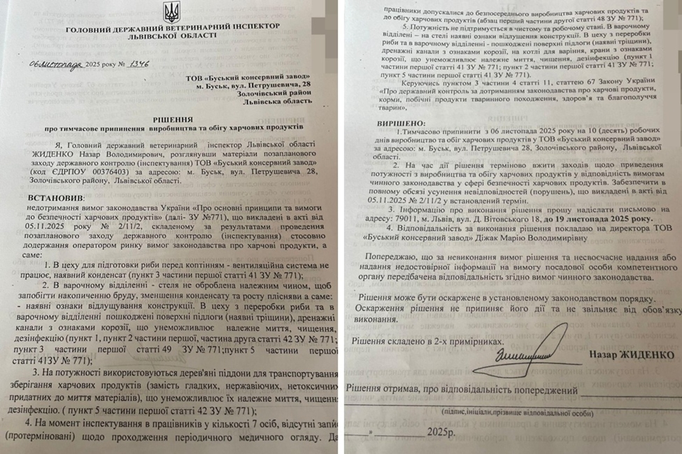 6 листопада 2025 року головний державний ветеринарний інспектор Львівської області, за результатами позапланової перевірки, виніс радикальне рішення: тимчасово припинити виробництво та обіг харчових продуктів на ТОВ «Буський консервний завод».