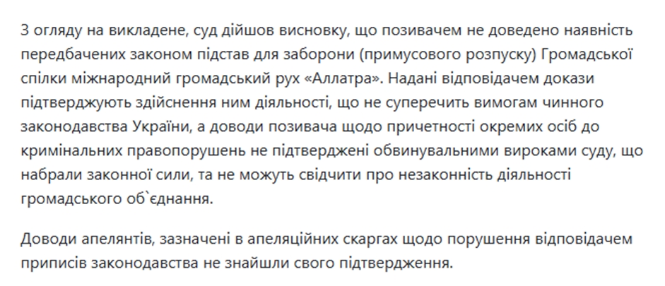 Остаточне рішення суду: ГС «АЛЛАТРА» діє законно та патріотично! Суд відхилив позов Мін'юсту та СБУ, підтвердивши, що діяльність спілки відповідає статуту. Більше того, у справі є докази, які "підтверджують здійснення Громадською спілкою «Аллатра» діяльності