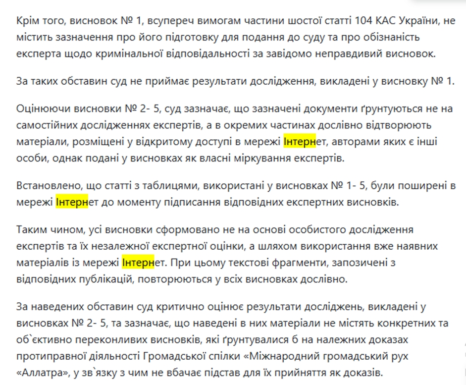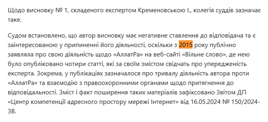 Суд визнав: експерт Кременовська, чиї висновки намагалися використати проти «АЛЛАТРИ», є упередженою. Шостий апеляційний адмінсуд встановив, що вона "має негативне ставлення до відповідача та є заінтересованою у припиненні його діяльності". Це провал спроби заборонити організацію.