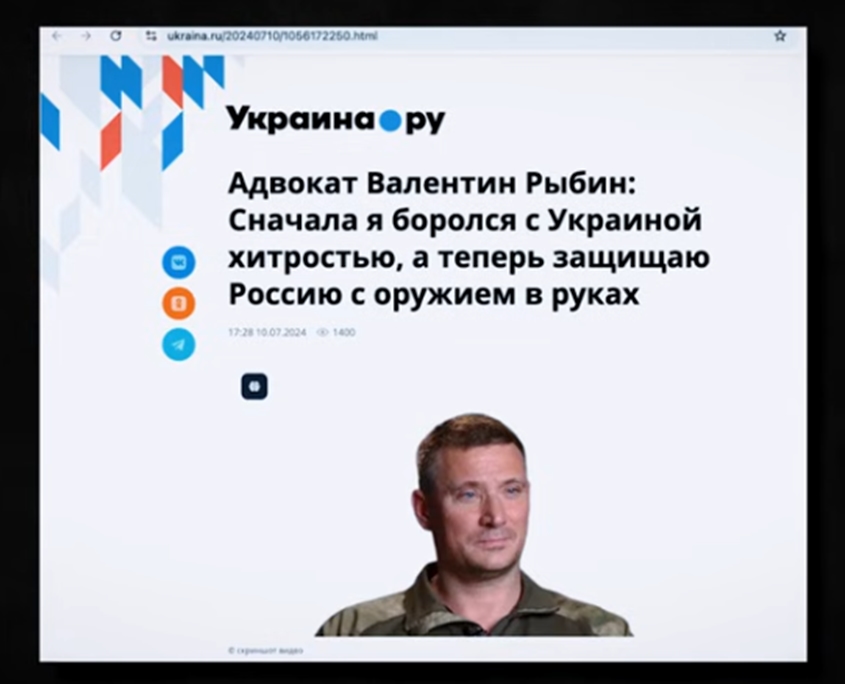 Адвокат Валентин Рибін: ”Спочатку я боровся з Україною хитрістю, а тепер захищаю Росію зі зброєю в руках. Я відразу ж після державного перевороту в 2014 році визначився, на чиєму я боці.”, зауважив він, коментуючи події у 2014 році в Україні. Хитрістю Рибіна в боротьбі з Україною є не лише інформаційні війни, які він веде з 2022 року, перебуваючи в рф, а й діяльність безпосередньо на території України. Рибін сказав: “З 14-го по 22-й рік у мене навіть в Україні, навіть у Києві були люди, які досить активно підтримували і мою позицію щодо тих хлопців, яких я захищав, і активно не погоджувалися з тим офіційним курсом, який проводила Україна.”