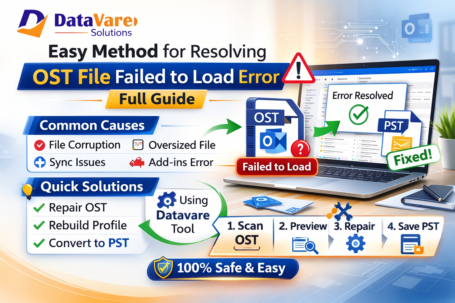 Microsoft Outlook users depend on OST files which allow them to retrieve mailbox content through offline accessibility. Many users experience the frustrating "OST file failed to load" error when they attempt to launch Outlook. Workflow interruptions occur when this problem prevents email access and leads to potential data loss through improper resolution methods. The guide will explain the problem causes together with Datavare OST to PST Converter Software solutions which include a professional method to address the issue.