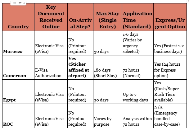Egypt: Expedited tiers are common, such as Rush (7-10 Days) and Super Rush (5-7 Days), allowing you to bypass the standard 10-12 day wait.
