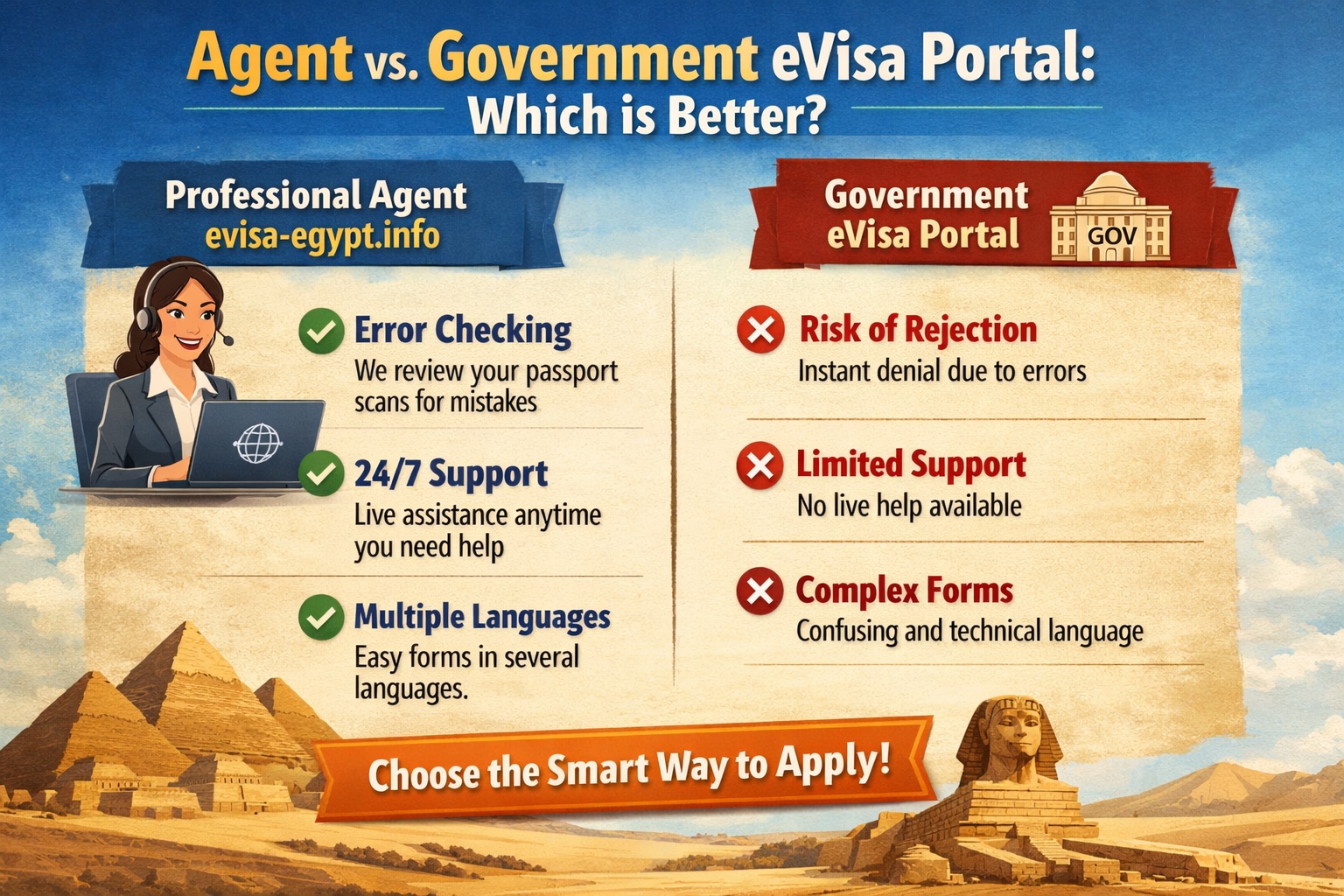 While the government portal is an option, many travelers prefer a professional agent like evisa-egypt.info for several reasons: