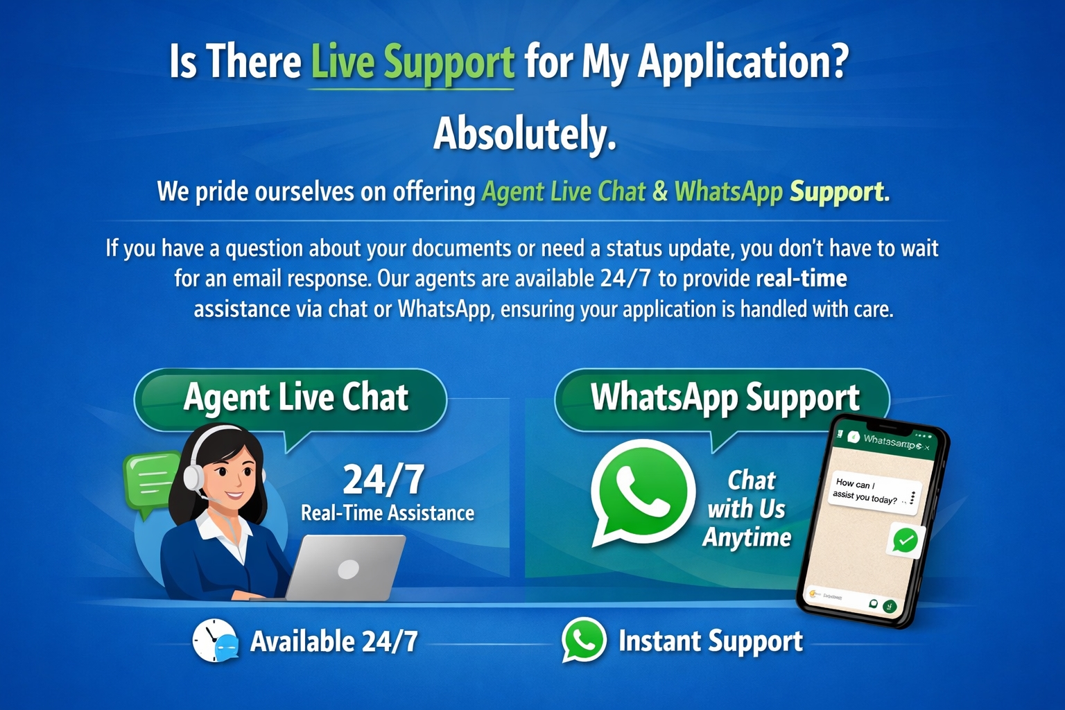 Absolutely. We pride ourselves on offering Agent Live Chat & WhatsApp Support. If you have a question about your documents or need a status update, you don't have to wait for an email response. Our agents are available 24/7 to provide real-time assistance via chat or WhatsApp, ensuring your application is handled with care.