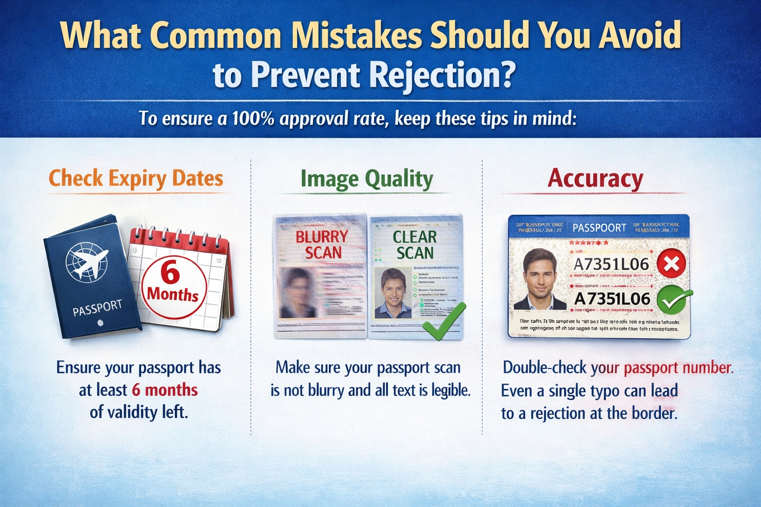 Accuracy: Double-check your passport number. Even a single typo can lead to a rejection at the border.