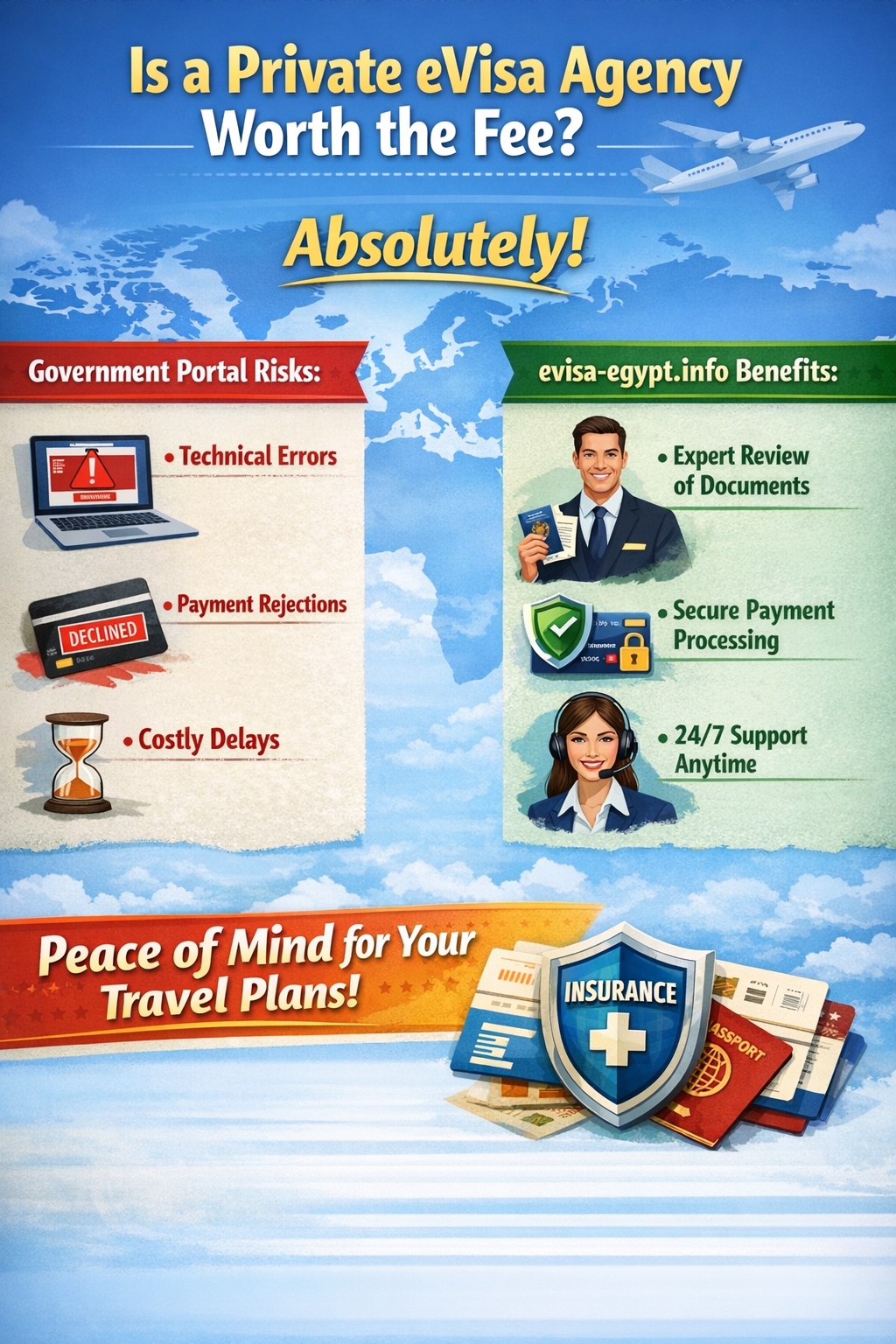 Absolutely. While you can attempt the government portal, many travelers face technical errors, payment rejections, or delays due to minor typos. Using a professional agency like evisa-egypt.info ensures your documents are reviewed by experts, your payment is processed securely, and you have 24/7 support to handle any issues. It provides "insurance" for your travel plans.
