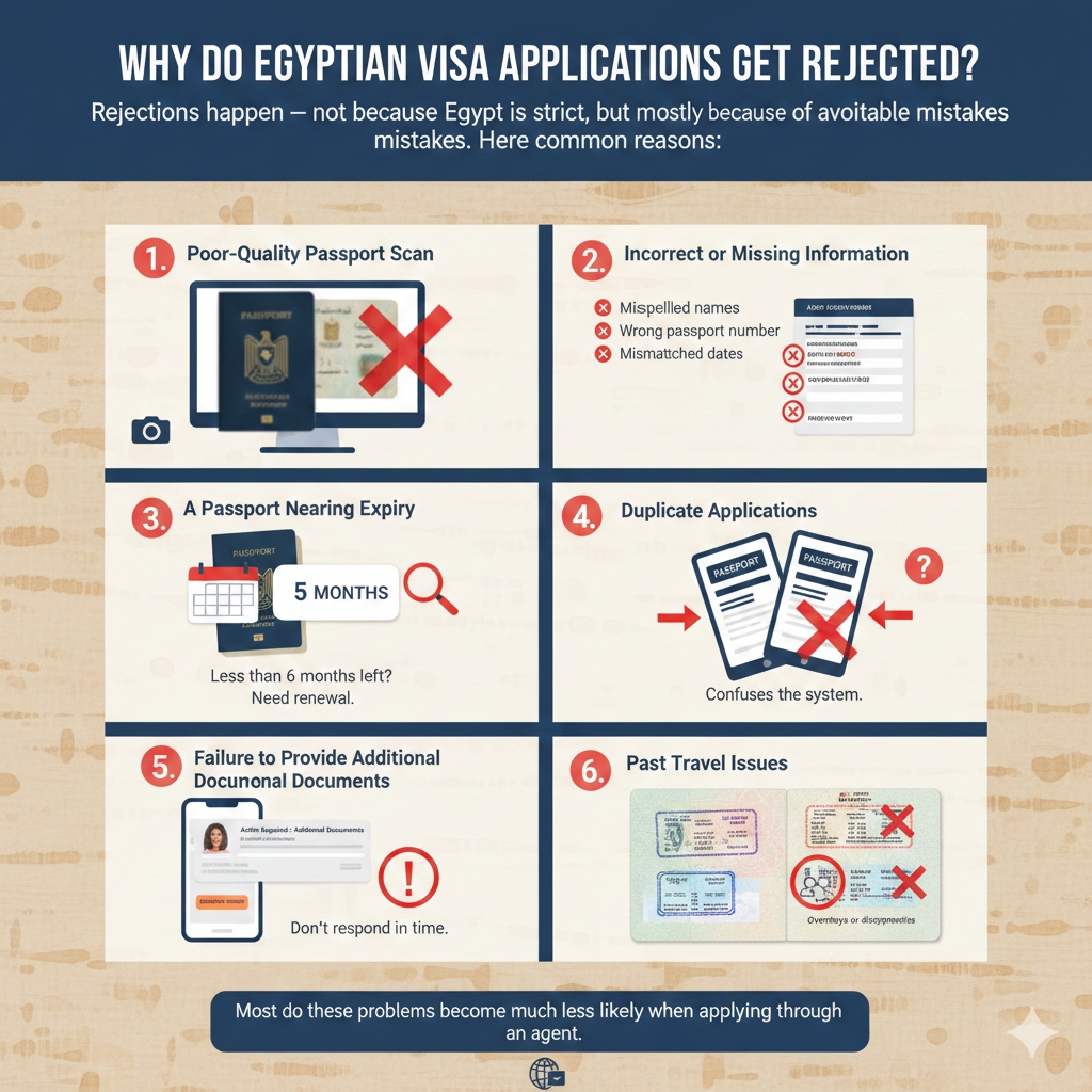 Rejections happen — not because Egypt is strict, but mostly because of avoidable mistakes. Here are the common reasons: