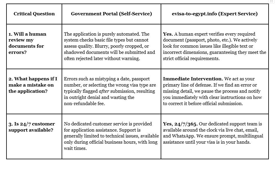 When applying online, it is important to understand how the total Egypt eVisa fee is calculated: Total Fee = Government Fee + Processing Fee (+ Rush/Super Rush)