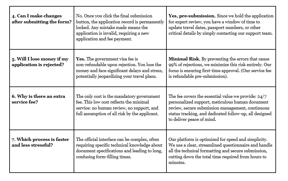 Processing Fee (Service Fee): This is the fee charged by the visa agency for checking your application, verifying your documents, and providing 24/7 support.