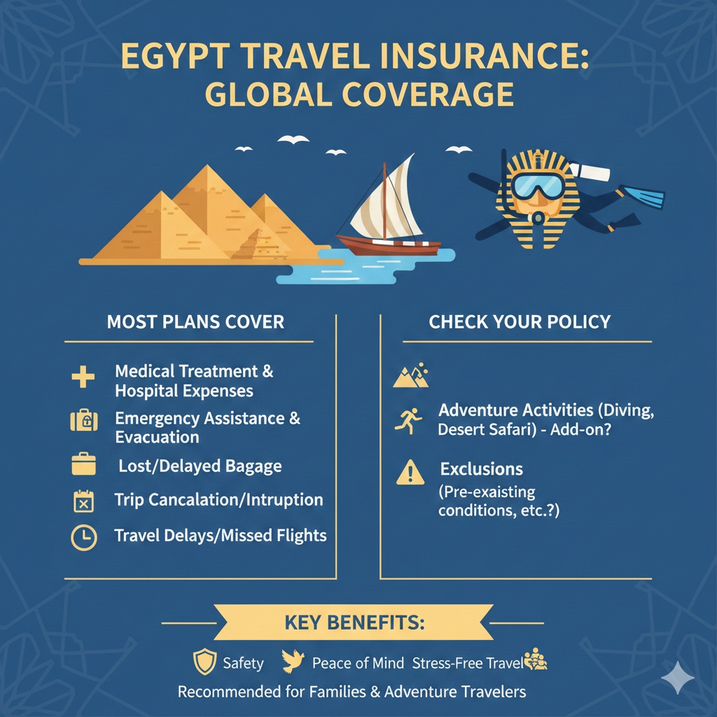 The globally recognized travel insurance plans can be used by travelers going to Egypt in case of medical support, emergencies, baggage loss, trip delays, or cancellations.