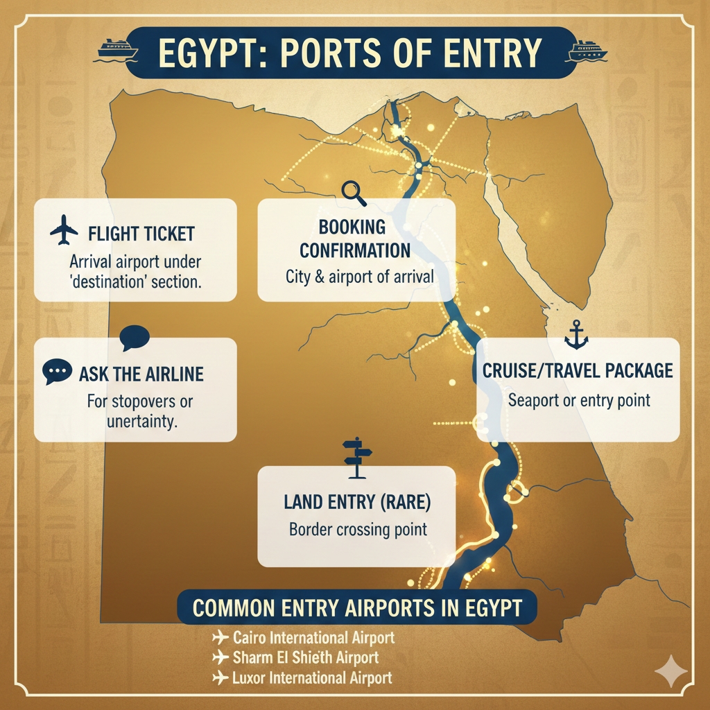 You can find your port of entry by checking the details of your travel booking and flight itinerary. The airport name or arrival location is always mentioned on your flight ticket and confirmation email.